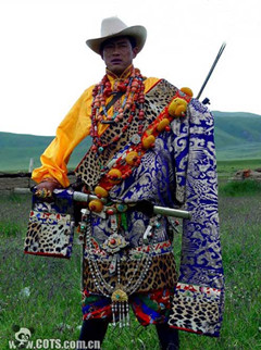 吐蕃時(shí)期   藏族服飾文化有了較大的發(fā)展。"中二丁王"時(shí)(相當(dāng)于中原西漢中期),南方雅隆河谷的吐蕃開始了冶煉鐵、銅、銀等礦產(chǎn),為金屬飾品的出現(xiàn)創(chuàng)造了條件。藏史記載,公元三世紀(jì)的拉妥妥日年贊時(shí),吐蕃贊普的服飾巳與眾不同,出現(xiàn)了服飾等級(jí)的差異。史載松贊干布時(shí)期,吐蕃的歷史翻開了新的一頁(yè),吐蕃文化得到迅速的發(fā)展,其服飾文化日漸發(fā)達(dá)。吐蕃奴隸制王朝等級(jí)森嚴(yán),在服飾上的表現(xiàn)也日臻完備。從反映吐蕃盛時(shí)的敦煌壁畫可看出,君臣服飾的等級(jí)差異,藏王一般只有贊普才能使用的三瓣寶冠箍住的有凹槽裝飾的無(wú)沿帽,呈紅色,通常高于一般人的帽子;藏王的侍從或臣下往往戴平頂無(wú)沿帽。衣袍的式樣也各有不同,官吏的章飾規(guī)定有一等瑟瑟,二等金,三等金包銀,四等銀,五等銅,六等鐵等大小兩類,共十二級(jí),裝在方圓三寸的盒子里掛在胸前,以區(qū)別職位的高低。武將的頭盔有形如塔的裝飾,戰(zhàn)士頭盔上有三只彩旗以表示出生的年月,隨著"惟以淬礪為業(yè)"的吐蕃冶煉業(yè)的發(fā)展,軍隊(duì)的鎧胄日趨精良,有的周身僅露兩個(gè)眼窩,勁弓利刃常不能破,其威嚴(yán)、勇猛之氣在今天大昭寺壁畫的吐蕃武士像中尚歷歷在目。吐蕃貴族不僅本人穿著華貴,還在聚會(huì)宴客時(shí),把傭人裝飾起來(lái)。而作為贊普的松贊干布則用一種紅帶子包頭,身著長(zhǎng)袍,足穿腳尖朝上的靴子,據(jù)《紅史》載,這種王服是受波斯王朝的影響,反映了文化交往已影響到了服飾文化層次,而從松贊干布伊始的吐蕃與中原的密切交往,兩種民族文化的長(zhǎng)期接觸更為藏族服飾的發(fā)展注入了新鮮血液。史載文成公主進(jìn)藏時(shí),帶入諸種花緞、錦、綾羅與諸色衣料二萬(wàn)匹,還有大量的金玉器具。松贊干布及吐蕃大臣紛紛自行去掉氈裘,改穿絹綺。近代西藏的高級(jí)官吏,頭發(fā)綰成一髻,戴金翅白紗帽,這是唐代進(jìn)士的服飾。此外,還采納文成公主建議,令國(guó)人禁止"赭面"(用油涂面),文成公主進(jìn)藏還帶來(lái)了種植蠶桑和紡織技術(shù),"植??椊z兮"大大的促進(jìn)了吐蕃服飾技藝的發(fā)展,青海海西州都蘭出土的大批吐蕃服飾文物,真實(shí)、生動(dòng)地反映了吐蕃服飾的工藝水平。服裝的織物紋樣多為聯(lián)珠動(dòng)物紋,裝飾品的金質(zhì)首飾、佩飾的精美使人嘆為觀止。今天藏族婦女飾品的鑲嵌形制,可以從這些文物中找到原型。斯坦因的《古代中亞文化遺跡》一書也曾提到:"在吐蕃發(fā)現(xiàn)的遺物中,有很多具有花紋的絲織物,花紋中有些是印的,有些是織的,花紋圖象的變化很多,這一點(diǎn)很可以表示吐蕃商業(yè)的地位,……大概是中國(guó)與西亞之間的貿(mào)易重點(diǎn)。"頻繁的交往促進(jìn)了吐蕃經(jīng)濟(jì)的發(fā)展,也促進(jìn)了服飾文化的發(fā)展。 吐蕃是一個(gè)軍事帝國(guó),在它的發(fā)展過(guò)程中征服融合了青藏高原及其邊緣地區(qū)的許多其他民族,這是造成今天各地區(qū)藏族之間文化差異的重要原因。在服飾的表現(xiàn)上也是如此。吐蕃時(shí)代這種差異主要表現(xiàn)為東女、附國(guó)、黨項(xiàng)等部落服飾的不同,東女部落住在康延川(今昌都),處于母系氏族社會(huì)發(fā)展階段,其女王穿青毛綾(氆氌)裙,上披青袍,袖長(zhǎng)到地,冬穿用文錦裝飾的羔裘。發(fā)作鬟髻狀,兩耳垂珰(耳環(huán))。足穿革素(皮靴)。一般男子披發(fā),婦女辨發(fā),男女都用彩色涂面。王死居喪三年,不易服,不梳洗。附國(guó)是以今四川甘孜為中心,包括今四川阿壩一帶的嘉絨藏人的藏羌融合體。他們頭戴圓形皮帽,或帶幕離佳(即面罩一類飾物,為婦女所帶)。身披毛曷毛(氆氌一類)、皮裘,穿牛皮鞋。頸系鐵索,手貫鐵釧。王與酋長(zhǎng)以金為首飾,胸前掛著三寸長(zhǎng)的金花。黨項(xiàng)則是純游牧部落,"服氈襲褐,披氈以為上飾",早在北周時(shí)巳能制造精美的犀甲、鐵鎧。四川西北部還有屬黨項(xiàng)部落聯(lián)盟的鄧至、武興國(guó)和宕昌等,服飾習(xí)俗為頭藏烏皂突騎帽,身穿長(zhǎng)袍,下著小口褲、足穿皮靴,與今四川牧區(qū)藏族服飾相似。此外青海地區(qū)有吐谷渾,貴婦人披錦袍,戴金花冠。如女發(fā)型為辨發(fā)披于后,后飾珠貝,以繁多為高貴,這一服飾與今青海藏族婦女大致相同。這些地區(qū)服飾特征是今天各地不同藏族服飾的母型。 吐蕃王朝崩潰后,從九世紀(jì)中期到第十一世紀(jì)的二百余年間,西藏社會(huì)一直處于分裂割據(jù)的混亂狀況。這一時(shí)期戰(zhàn)亂不堪,服飾藝術(shù)的發(fā)展也難免厄運(yùn),停滯不前,而與戰(zhàn)爭(zhēng)有關(guān)的武士服飾卻濟(jì)時(shí)發(fā)展。在西藏阿里古格王國(guó)的遺址中,發(fā)掘有大量古代武士的盔甲和武器。其鎧甲多為鋼片甲,是用細(xì)皮條串結(jié)鋼片而成,串結(jié)方法頗為復(fù)雜,武器中的盾牌,系用藤條編織為圓形,直徑八十厘米,正面鑲有銅質(zhì)加固件,銅件上雕刻有細(xì)密的紋飾,故亦可謂是銅飾件,背面有四個(gè)銅環(huán),環(huán)間可用皮條相連,作握柄之用,無(wú)論這些服飾和兵器,是西藏本地生產(chǎn),還是外來(lái)流入,都說(shuō)明其時(shí)西藏的武士服飾已具鮮明