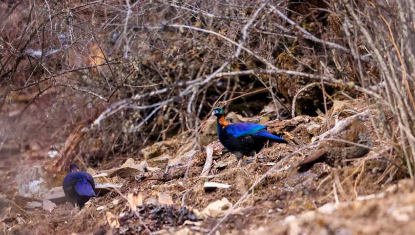 “它們在那里待了有一個小時左右,后來太陽出來,它們又飛到對面的山上去了?!敝烊纬f,當時,十余只綠尾虹雉離開時,從我們頭上飛過,它們的翅膀劃破空氣聲都聽得清清楚楚,非常激動。