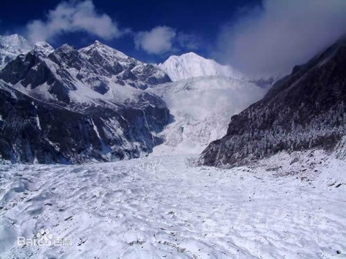 沿冰川上行三公里,繞過(guò)黑松林,即可望見(jiàn)這條大冰瀑布。冰瀑布寬達(dá)1100米,落差1080米,由無(wú)數(shù)極其巨大的光芒四射的冰塊組成,仿佛從藍(lán)天直泄而下的一道銀河。除非你親眼見(jiàn)到,沒(méi)有任何詞匯能形容它的瑰麗笥偉大。冰川最高點(diǎn)的海撥為6750米,而最下端的海撥高度僅為2850米,它不但是低緯度低海撥的冰川,而且是落差最大的冰川。